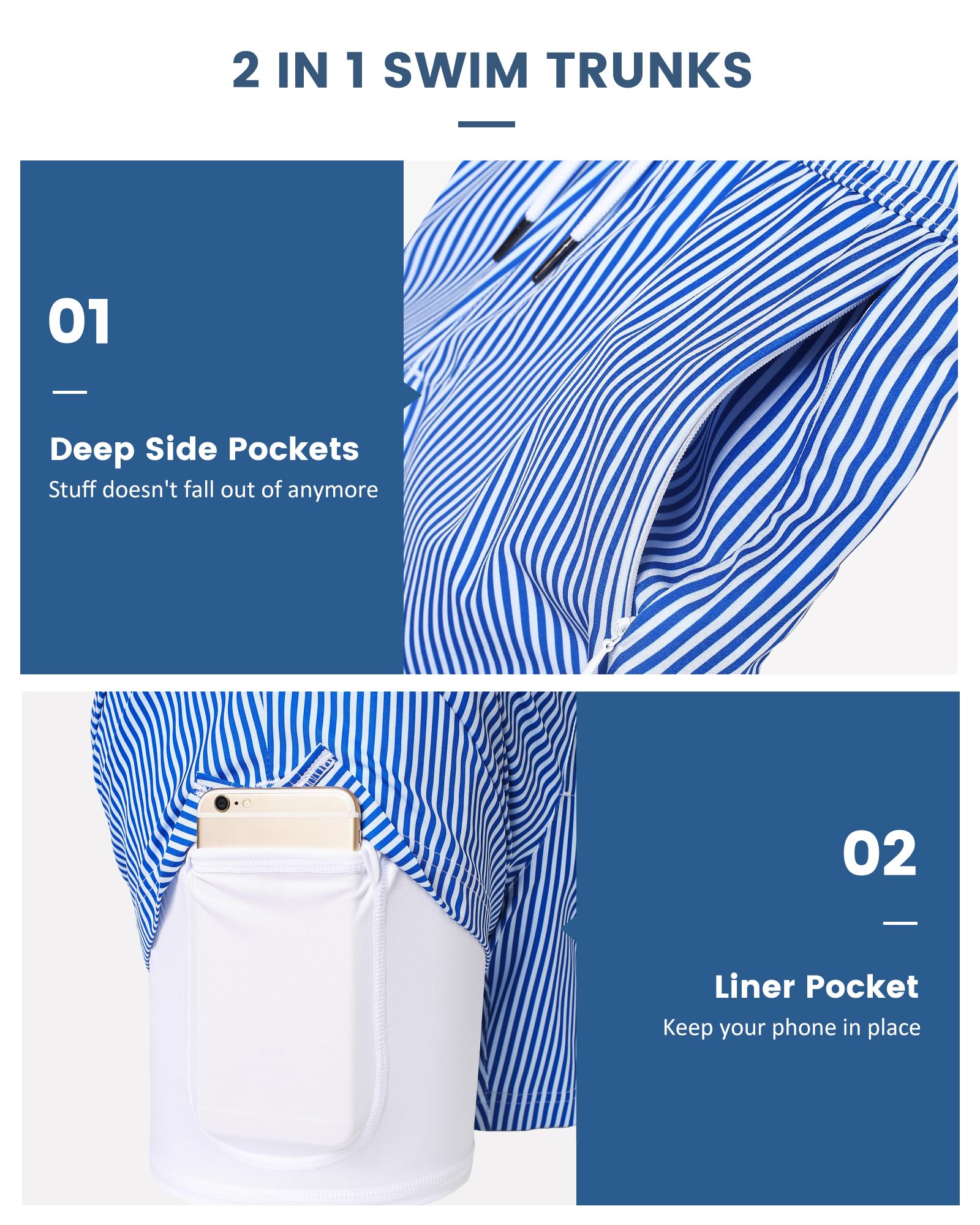 - 【Stay Organized On The Go】 The mens board shorts feature 3 pockets for easy access. External zippered compartments securely hold keys and transit cards, while the inner stretch sleeve keeps your phone snug and scratch-free. With smart organization, grab essentials quickly—no more digging around